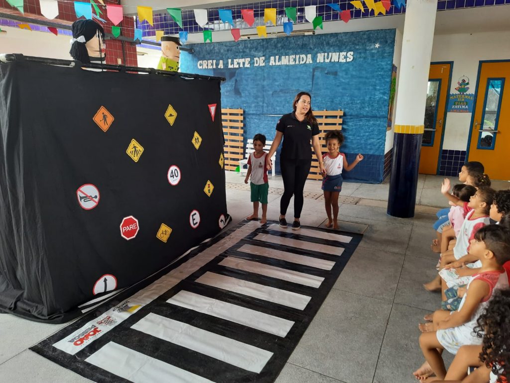 ‘Dona Faixinha e Seu Agente de Trânsito’, personagens do teatro de bonecos da Divisão de Educação (Died) da Semob-JP, fizeram a alegria das crianças, que cantaram músicas temáticas de segurança no trânsito e interagiram com os dois personagens, aprendendo de maneira animada, todas as lições da equipe da Died. Ao final, as crianças receberam cartilhas e kits de desenho e pintura. “Ficamos felizes com essa atividade aqui na escola, porque é uma maneira criativa de transmitir conhecimento às nossas crianças”, destacou Edizelda Andrade, gestora do Crei.