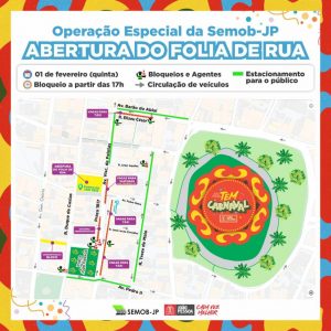 A Superintendência Executiva de Mobilidade Urbana de João Pessoa (Semob-JP) planejou, para esta quinta-feira (1º), quando acontece a abertura do Folia de Rua, uma operação especial de trânsito e transporte com o objetivo de garantir a segurança viária, o disciplinamento do fluxo de veículos e os deslocamentos dos usuários de ônibus até o Ponto de Cem Réis, local onde ocorrerão os shows de Alceu Valença, Yuri Carvalho e Renata Arruda. e Diana Miranda.