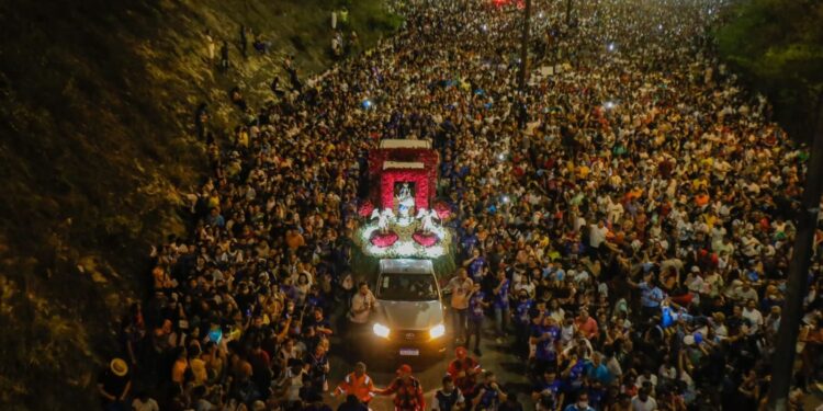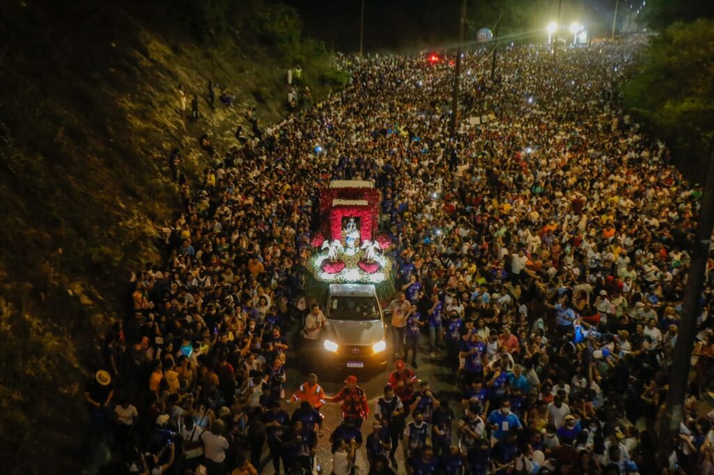 Os cantos e preces destinados à Nossa Senhora da Penha retomaram as ruas de João Pessoa neste sábado (26). Durante toda a noite e madrugada deste domingo (27), milhares de fiéis caminharam em procissão da Igreja de Lourdes, no Centro, até o Santuário da Penha, em rito de 259 anos de tradição que não ocorria desde 2019, devido à pandemia de Covid-19. O cortejo foi acompanhado pelo prefeito Cícero Lucena e a primeira-dama Lauremília Lucena.
